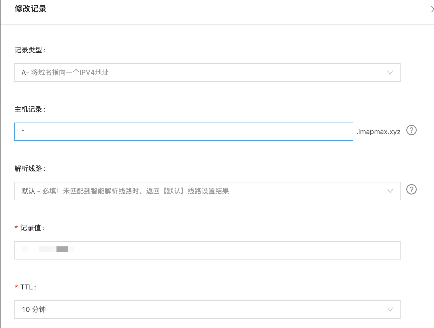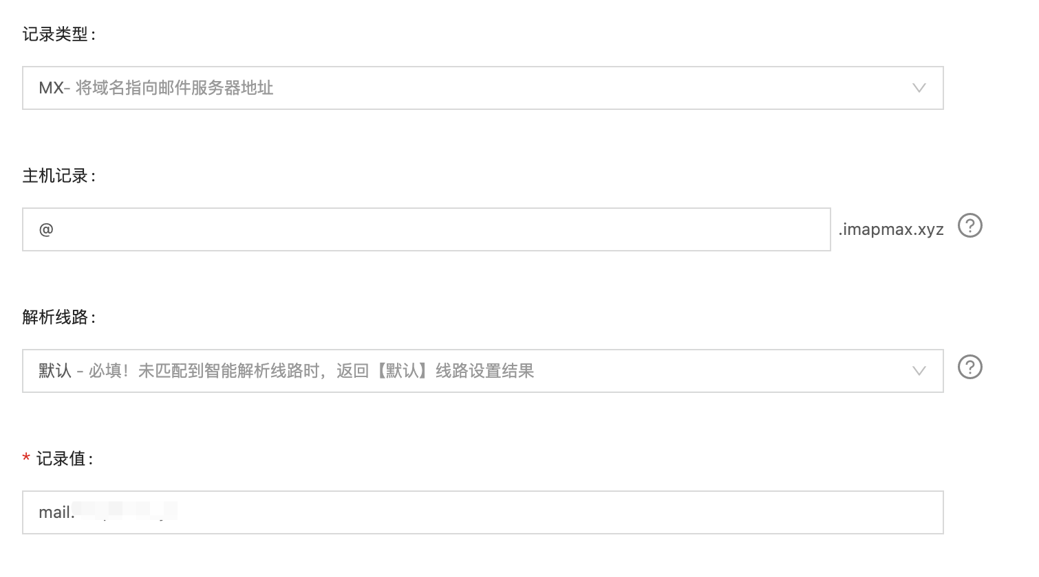 第二条解析记录类型为MX,记录为@,代表我之后的邮箱服务器叫xxx@imapmax.xyz,如果叫mail,那么我以后的邮箱服务器就是xxx@mail.imapmax.xyz,这个的记录值我设为mail.imapmax.xyz,最后指向的就是我刚才设置A记录中的记录值