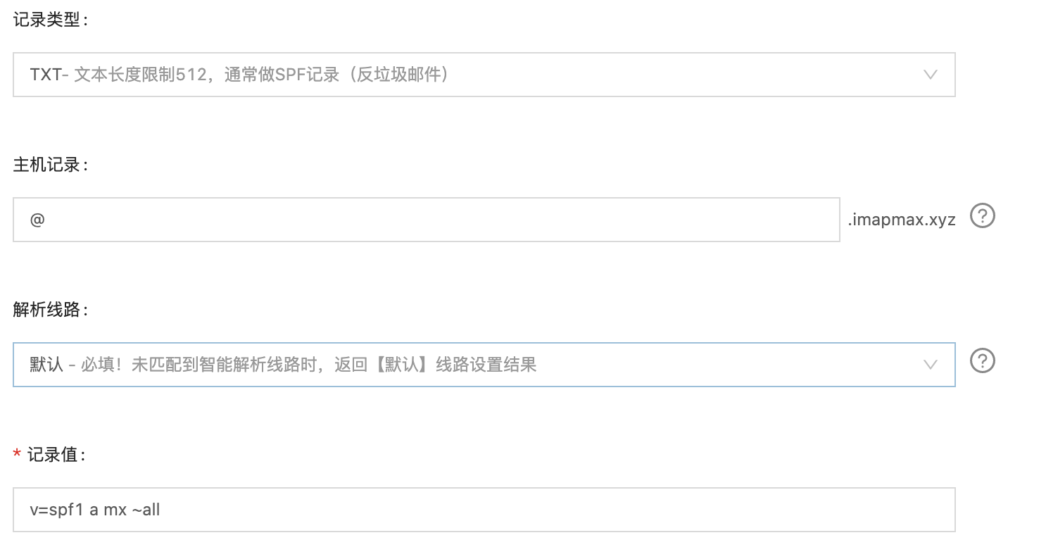 第三条是一个TXT记录,作用是配置SPF,记录值设置为v=sopf1 a mx ~all